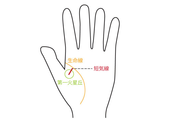 「短気線」とは、生命線の内側(親指側)にあります。第一火星丘(親指と人差し指の間の、水かきのような部分に近いふくらみ)から出て、生命線の手前で止まる、とても短い線です。