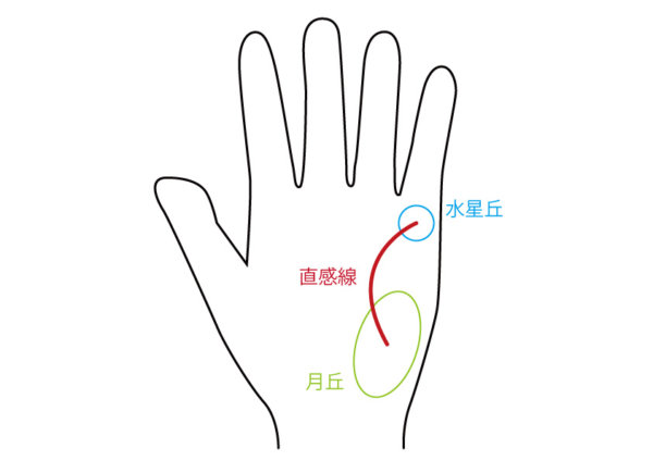 「直感線」とは、月丘(小指の真下で、手首に近いところのふくらみ)から水星丘(小指の付け根)に向かうカーブの線です。直線ではなく、カーブというところがポイントです。