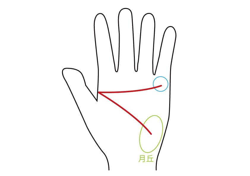 知能線が、「月丘中部・下部に向かう(特に:生命線から出ている)」「生命線と平行になっている」「ゆったりと曲がる長い線となり、手首の中心に下がる」という手相の方が、これに当てはまります。