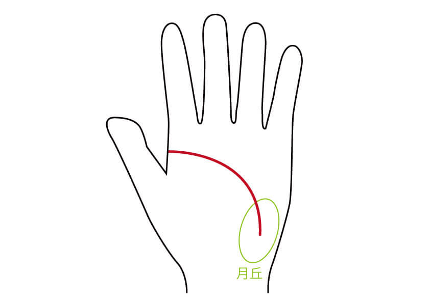 月丘とは、小指の真下であり、かつ手首側にあるふくらみのことです。月丘は、「上部・中部・下部」と分けることが多いので、月丘上部は、「月丘の上3分の1」と考えると分かりやすいですよ。