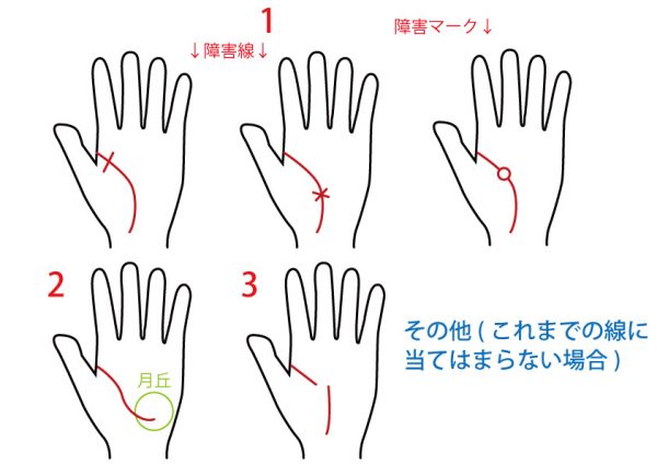 障害線は占いたい線(この場合は生命線)を横切る短い線、障害マークは〇や×などのマークが占いたい線上にある状態のことです。これらの障害線や障害マークがあるときというのは、生命線が司るもの、つまり生命力に陰りがあるときです。事故や病気など、予想しづらいような大きなトラブルの前兆ですので、注意深く生活してください。