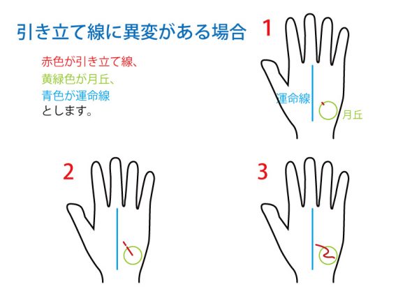 引き立て線は、月丘(手首の付け根、かつ小指側)から出て、運命線(手首の付け根から真っ直ぐ中指の付け根に向かう線)に向かう、斜めの線です。ただし、この位置にある斜めの線であればどれでも「引き立て線」かというと、そうではありません。引き立て線は、運命線を超えない短い線でないといけないのです。もし、運命線を超えるほど長い線でしたら、「寵愛線」という違う線に分類されます。