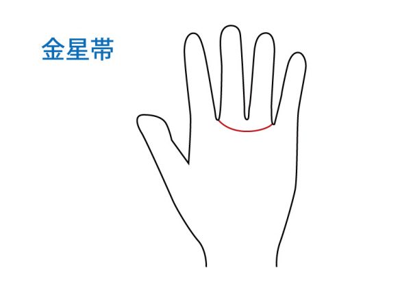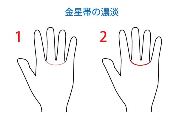 中指と人差し指の間と、小指と薬指の間を結ぶ線であり、ゆるやかなカーブを帯びた線となります。金星丘は親指の付け根にありますが、金星帯は土星丘・太陽丘の付近にあります。名前はとても似ていますが、混同しないようにしてくださいね。