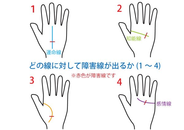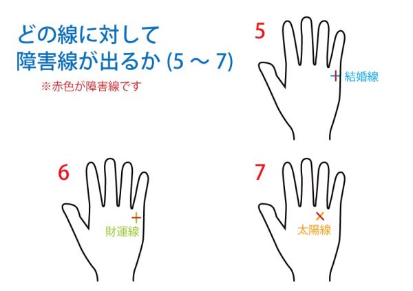 障害線は、「トラブル」を司る線です。何においてのトラブルかは、どの線に対して障害線が入っているかによって左右されます。例えば結婚線であれば結婚生活で、財運線であればお金に関することで、それぞれトラブルがある・・・といった感じです。