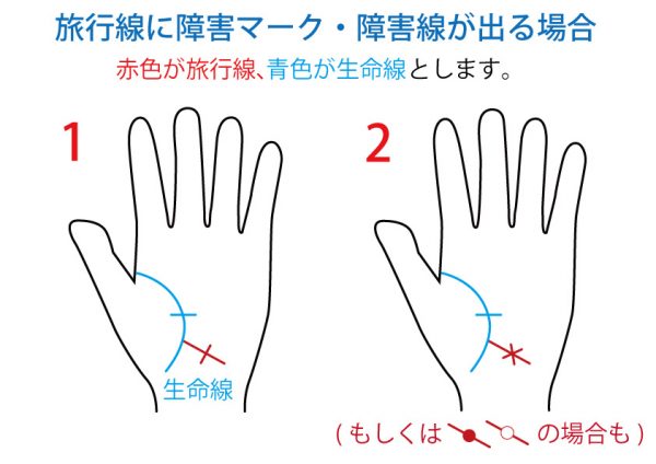 1を更に悪い方向に進めた手相となります。旅行先でかなりトラブルがあります。この時期は旅行をやめ、日常生活に目を向けてください。旅行に出なくても得られる幸せを見つけ、「旅行に行くことでこの幸せを失ってはいけない」という認識をしっかり持てば、旅行に行けなくても気持ちを納得させることができます。