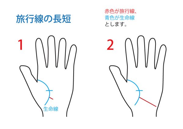 短くても旅行線があるのであれば、旅行に対する興味はしっかりとあります。1の手相の場合は、お気に入りの旅行先に行くのではなく、今まで行ったことがないような新しい場所へ旅する方が良いです。現地でしか味わえない感動をしっかりと味わい、人生における「初体験」をたくさん得てください。その感動は、旅先から帰ってきてもずっと残り、あなたの人生観に大きくかかわってきます。また、2よりかは旅行に関する運が強いわけではないので、短期間の旅行にとどめておいた方が吉です。
