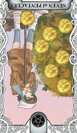 ペンタクルの7の逆位置は、報酬や貯蓄などに不満があります。不満や物足りなさだけに留まらず、将来性のなさを悲観してがっかりしています。