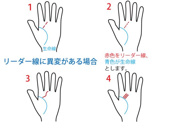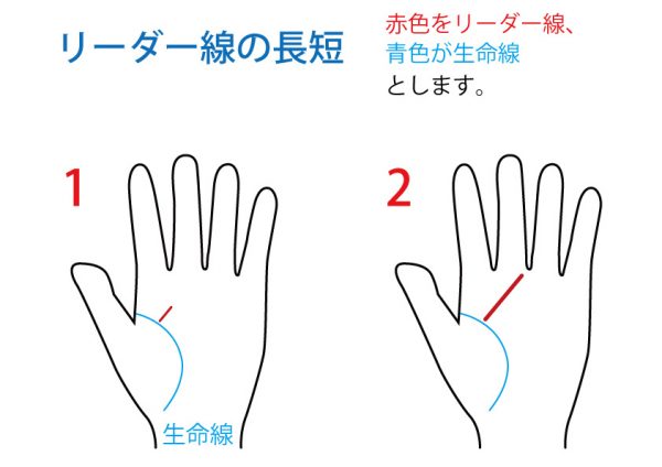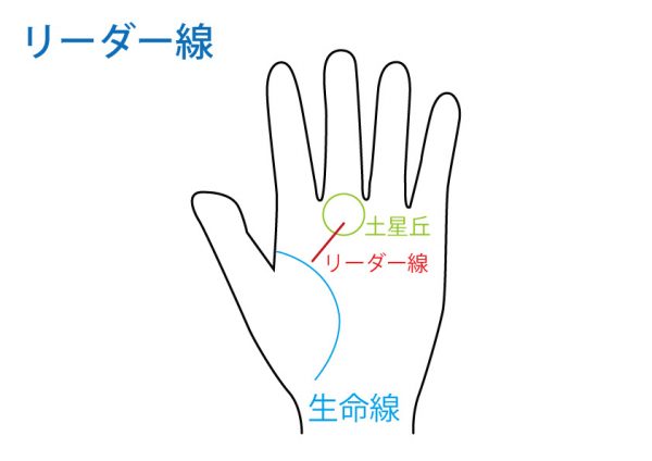 リーダー線は、生命線から出て、土星丘(中指の付け根)に向かいます。生命線から少し離れた場所が始点になっていることもありますが、大きく離れていないようであれば問題ありません。