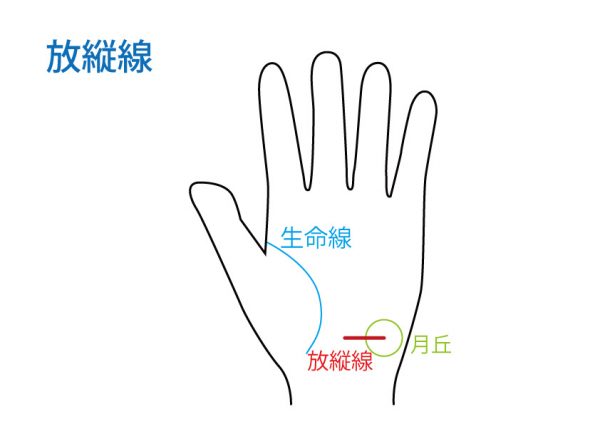 放縦線とは、月丘(小指の真下であり、かつ手首の上の部分)から出て、生命線に向かう線のことです。多くの場合、横線なので、ぱっと見でもわかりやすいです。ほとんどの場合、生命線にたどり着かずに途中で途切れますが、中には例外(「放縦線の長短:1」)もあります。