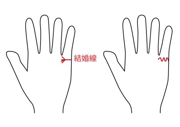 また、「結婚線が下にカーブし、その近くから新しい結婚線が更に出ている」という場合もあります。この場合は、元の結婚線と新しい結婚線がくっついている「枝線」ではなく、あくまでも結婚線の「近くから」出ている新しい結婚線なので、ご注意ください。