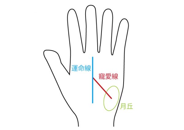 寵愛線とは、月丘(小指の真下で、手首側のふくらみ)から出ている線で、運命線に向かって伸びる線のことです。