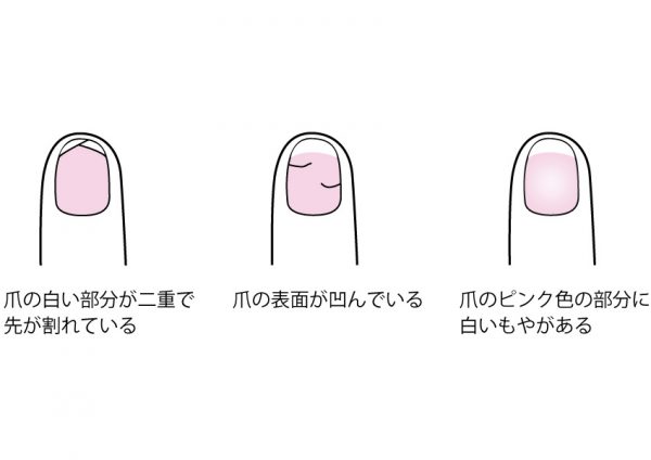 「爪の白い部分が二重になっていて、先が割れている」「爪の表面が凹んでいる」「爪のピンク色の部分に、白いもやがある」・・・このように、爪にダメージを受けている場合は、心身ともにストレスがかかっています。