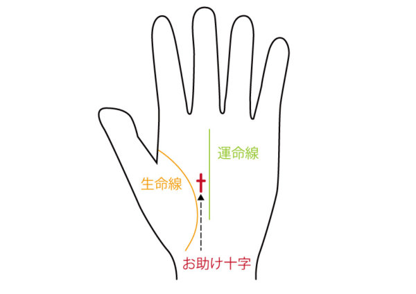 お助け十字とは、運命線と生命線の間にある、十字のことを指します。角度によっては×印に見えることもあります。生命線と運命線の間の距離が狭いと見つけづらいこともあるので、じっくりと探してみてください。