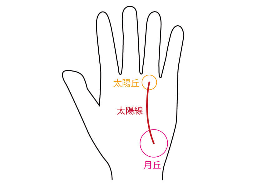 太陽線は、太陽丘(薬指の付け根のふくらみ)に向かう線のことです。ですので、始点が月丘にある太陽線を探してみてください。