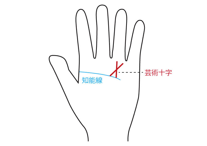 芸術十字とは、「知能線から横に向かう枝線が出ている」「その線が太陽線(薬指の付け根のふくらみである、太陽丘に向かう線)と交わる」という二つの条件をクリアしたものとなります。知能線から出る枝線が横線、太陽線が縦線となり、十字の形になっているのが特徴です。