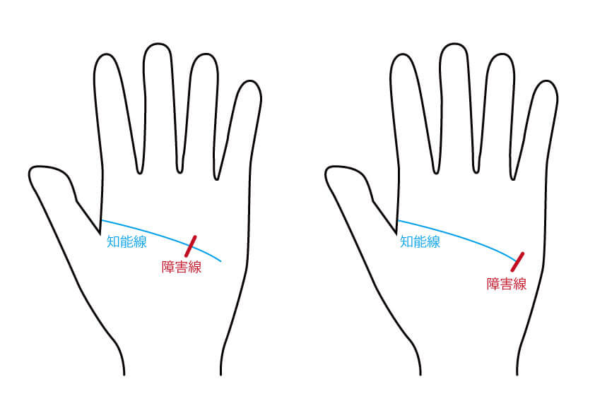 障害線とは、他の線を遮るように出る短い線のことです。知能線を遮る、短いけれどはっきりとした線があるかを探してみてください。