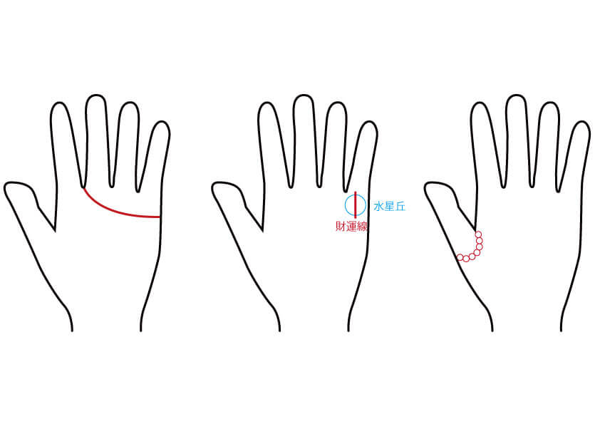 「財運線が長く、水星丘の真ん中を直線で横切る」という手相の方は、節約上手です。安く効率的な買い方を知っており、浪費も嫌いなので、貯金するスピードも早いです。