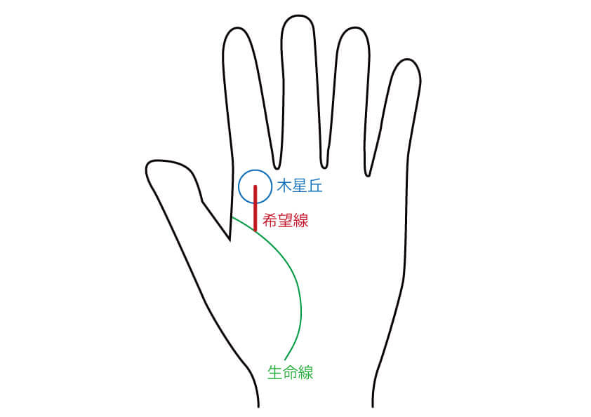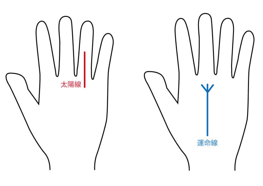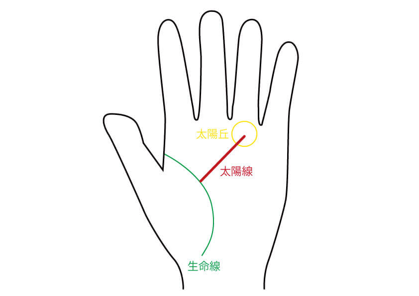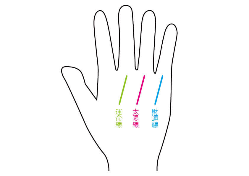 運命線は、土星丘(中指の付け根のふくらみ)に向かう縦の線です。太陽線は、太陽丘(薬指の付け根のふくらみ)に向かう線です。希望線は、生命線から出て、木星丘(人差し指の付け根のふくらみ)に向かう線です。