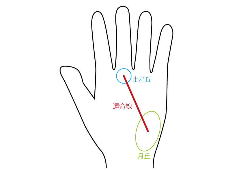 ちなみに、「運命線が濃く、月丘から出て土星丘に届く」という手相の方は、生まれ育った場所から離れ、親や友達となかなか会えない状況に自分を追いやることで成功します。環境を変え、今までとは違う状況に自分を置くことで、意地でも独り立ちすることができるのです。