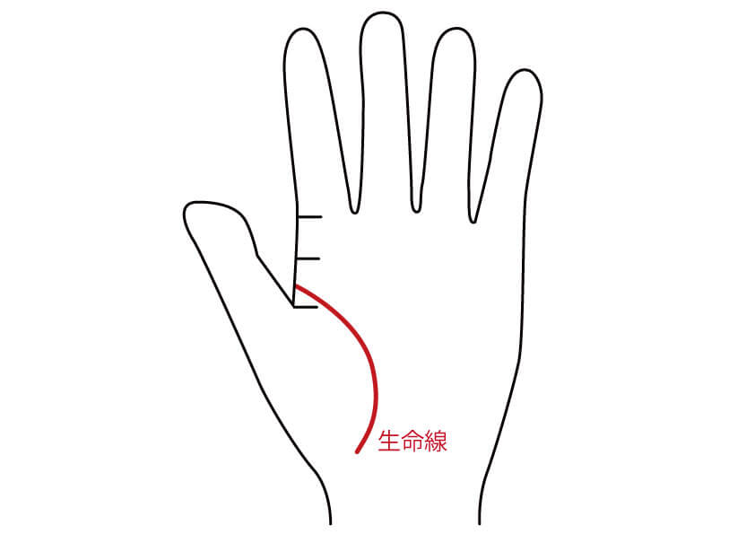 生命線の始点は「親指と人差し指の中間地点」です。そこよりも下、つまりどちらかというと「親指に近い場所」が生命線の始点になっているものが、この項目に当てはまります。