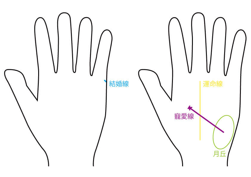 寵愛線とは、始点が月丘(小指の真下で、かつ手首の近くにあるふくらみ)で、運命線(中指のつけねに向かう縦の線)と接したところで終わるか、運命線を通り越して終わる線のことです。