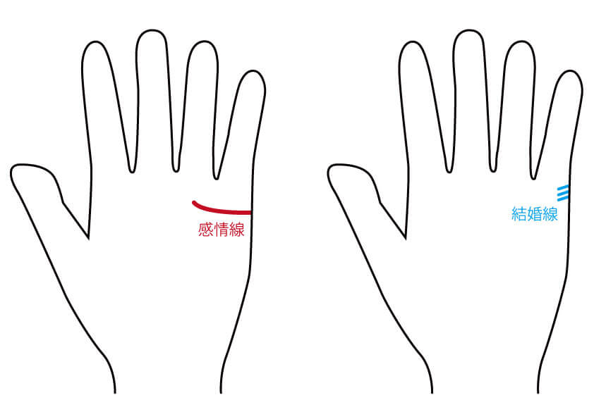 結婚線は、小指側の側面から、水星丘(小指の付け根のふくらみ)に向かう短い線のことです。