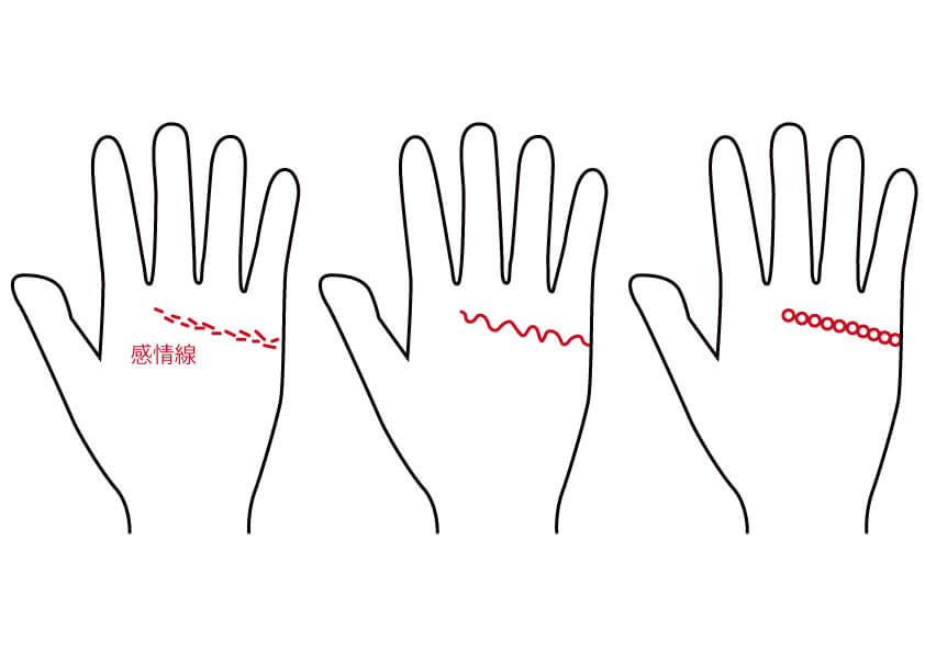 「感情線が濃く、手のひらの端まである(特に:木星丘の下を通る場合)」「感情線の終点が、人差し指の付け根にある」「感情線が、中指と人差し指の間で下がる」「感情線の末端が、大きくカーブして下がる」という手相の方が、これに当てはまります。