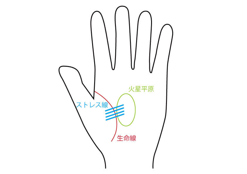ストレス線とは、始点が生命線の内側で、終点が火星平原(手の平の中央で、へこんでいる部分)にある、複数の線のことです。かなり細い線ですので、見落とさないようにしっかりと探してください。