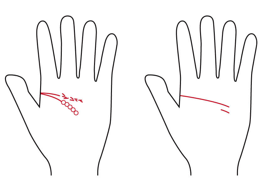 このタイプの手相の方は、生きようとする力がとても弱く、人生に対して前向きなビジョンを持つことができません。「どうせ、努力しても報われない」という卑屈さも出てくるため、何事にも挑戦しない消極的な性格となります。