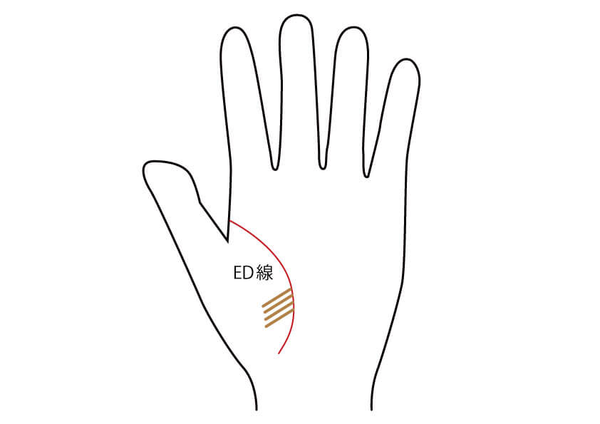 ED線とは、始点が生命線上にあり、下に下がる複数の線のことです。こちらも細いです。