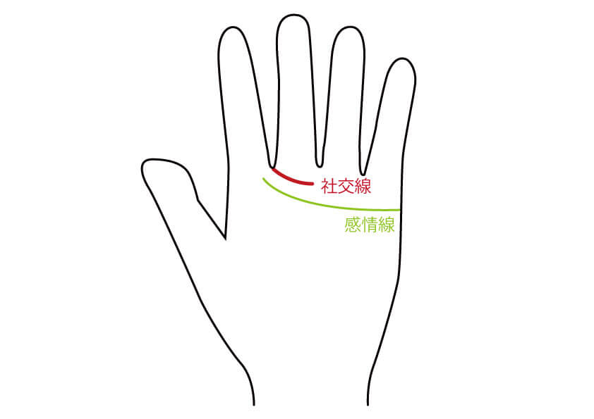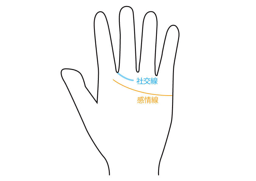 社交線とは、中指と人差し指の間から出て、感情線に沿ってその上部を走る線のことです。ただ、薬指の中央よりも手前で終わります。