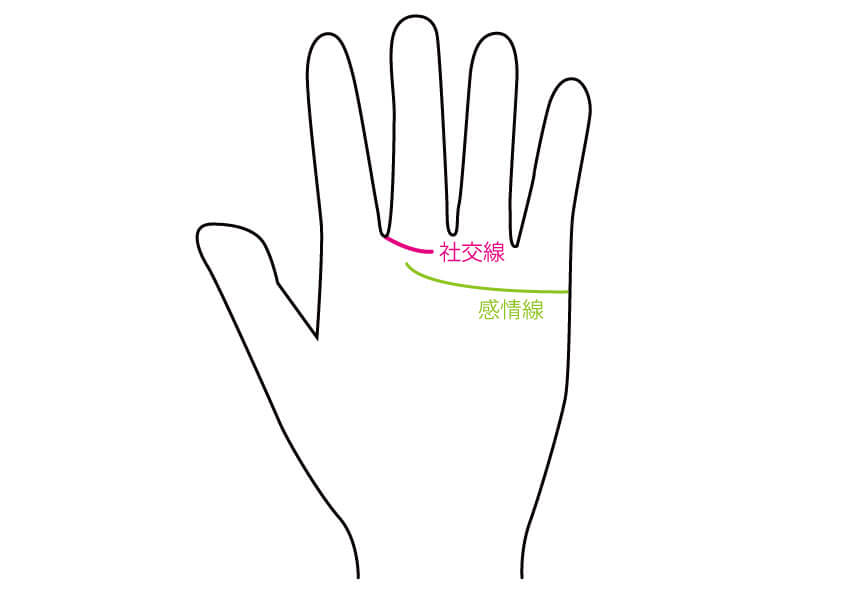 社交線とは、始点が中指と人差し指の間にあり、感情線の上に現れる平行線のことです。ただ、薬指の中心よりも手前で終わるので、基本的には短い線となります。